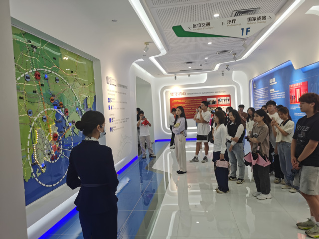 本次研学活动的第二站为横琴粤澳深度合作区展示厅,横琴粤澳深度合作区位于广东省珠海市香洲区横琴岛,横琴粤澳深度合作区展示厅以“横空出世,琴鸣天下”为主题,分为“印象篇”、“足迹篇”、“规划篇”、“建设篇”和“未来篇”五大展示单元。师生通过展厅现代化的高科技展示技术,直观生动地了解横琴的区位交通、粤港澳合作、城市规划、发展历程和发展成果等内容。同时在讲解员的讲解介绍下观看了横琴发展记录片,体悟到了横琴在珠三角发展战略开发中的重要意义,领会了合作区成立下的横琴发展新思路,更加深入地把握了“珠澳合作”、“建设粤港澳大湾区”、“建设横琴粤澳深度合作区”的战略定位。