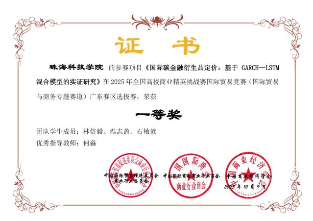 在强调理论深度与学术规范的国际贸易与商务专题赛道中,学院团队以严谨求实的研究态度赢得佳绩,共获得一等奖6项、二等奖2项。参赛论文瞄准人工智能、数字货币、碳金融等热点议题,展现出对国际经贸趋势的敏锐捕捉和模型实证的扎实能力。