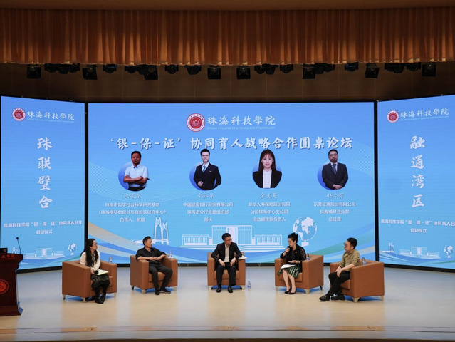 最后,在“银-保-证”协同育人战略合作圆桌论坛上,珠海科技学院金融与贸易学院教授、珠海市哲学社会科学研究基地《珠海横琴数据谷与自贸区研究中心》负责人沈颂东,中国建设银行股份有限公司珠海市分行党委组织部部长卓林伟,新华人寿保险股份有限公司珠海中心支公司综合管理部负责人金美英,东莞证券股份有限公司珠海横琴营业部总经理赵文辉展开深度对话,就湾区金融人才培养模式创新、行业需求与高校教育衔接、实习就业一体化等议题进行了充分交流,为后续合作落地凝聚了共识。
